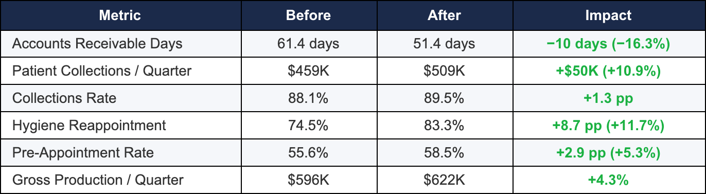The headline numbers tell a compelling story. Practices reduced accounts receivable by 10 full days after adoption, freeing roughly $45,000 in working capital per practice. Annual collections increased by approximately $200,000 per practice. And the hygiene reappointment rate — a leading indicator of long-term patient retention and recurring production — jumped 8.7 percentage points, the single strongest improvement across all KPIs measured.